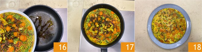 Invertid la sartén con un movimiento decidido y rápido, dejad deslizar la tortilla invertida en la sartén 16. Coced también del otro lado durante unos 5-8 minutos 17. La tortilla de guisantes y zanahorias está lista 18.