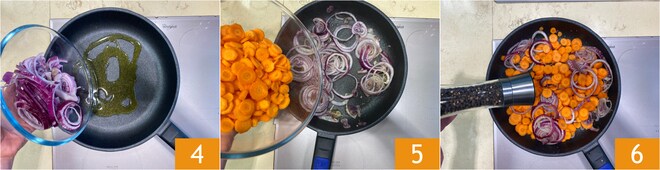 Ahora en una sartén de 28 cm de diámetro (medidos en la superficie, 24 cm el fondo) echad un chorrito de aceite y las cebollas 4. Rehogad a fuego bajo durante 5 minutos. Pasados los 5 minutos agregad las zanahorias 6 y coced durante unos 10 minutos siempre a fuego bajo. Poned pimienta 6