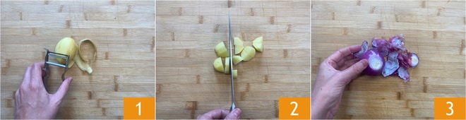 Para preparar la tortilla de patatas y cebolla, pela las patatas 1 y córtalas en trozos no muy grandes 2. Luego, limpia las cebollas rojas 3.