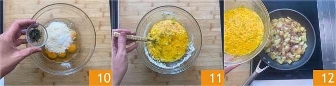 Aromatiza con tomillo 10, sal y pimienta al gusto, luego mezcla todo 11. Vierte la mezcla de huevo sobre las patatas y cebollas cocidas 12.