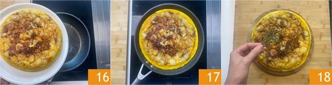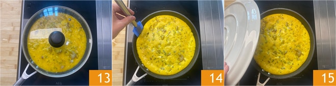 Deja cocinar durante unos diez minutos con una tapa 13 a fuego medio-bajo, redondeando bien la forma, si es necesario, con una espátula. Cuando sea el momento de dar la vuelta a la tortilla (puedes intentar levantar la base con la espátula para evaluar la cocción) 14, ayúdate con un plato para voltearla 15.