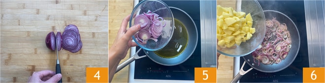 Rebana las cebollas finamente 4. En una sartén, sofríe primero la cebolla con un poco de aceite 5 durante 5 minutos a fuego medio, removiendo frecuentemente. Luego, añade las patatas 6 y déjalas dorar durante unos minutos más, siempre removiendo.