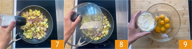 Sazona al gusto con sal 7, tapa con una tapa 8 y deja cocinar por unos 20 minutos, sin olvidar remover de vez en cuando. Deben quedar suaves y bien doradas. En un bol, vierte los huevos y el Grana Padano DOP rallado 9.