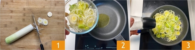 Para preparar la tortilla de puerros, empezad por estos últimos. Limpiadlos eliminando las hojas más externas, la parte verde y eventuales raíces; luego cortadlos en rodajas de aproximadamente 2 mm 1. En una sartén de 28 cm de diámetro, calentad un chorrito de aceite, luego añadid los puerros 2 y sazonad con sal 3.