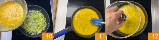 Verted la mezcla en la sartén con los puerros bien caliente 10, luego distribuid los huevos de manera uniforme con una espátula 11 y cubrid con una tapa 12.