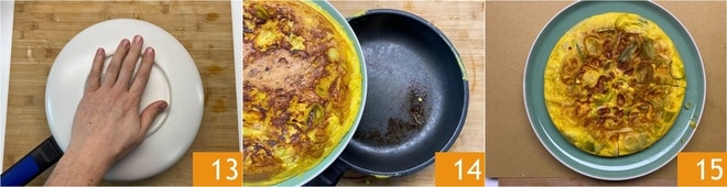 Coced a fuego medio durante 15 minutos, luego dad la vuelta a la tortilla con la ayuda de un plato 13 y transferidla de nuevo a la sartén 14. Cocinad también por el otro lado durante 7 minutos bajando ligeramente el fuego. Transferid la tortilla de puerros a un plato de servir y servid 15!
