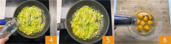 Sofreíd los puerros durante unos 6 minutos a fuego medio, añadiendo un poco de agua a mitad de cocción para no quemarlos 4; deberán quedar dorados y bien pochados 5. Mientras tanto, en un bol verted los huevos y sazonad con sal y pimienta 6.