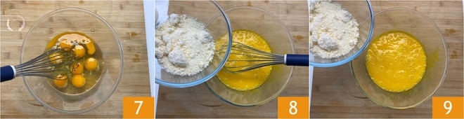 Batid con unas varillas 7, luego añadid el Parmigiano Reggiano DOP rallado 8 y el pecorino rallado 9.