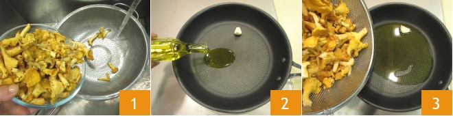 Para preparar la tortilla de rebozuelos, lo primero que hay que hacer es limpiar las setas bajo el agua corriente 1. En una sartén de aproximadamente 22 cm de diámetro (la misma sartén que se utilizará para cocinar la tortilla) calienta el aceite con el diente de ajo 2, luego añade los rebozuelos 3.