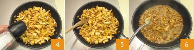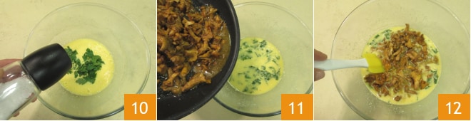 Salpimienta 10 y mezcla, luego incorpora las setas 11 y mezcla nuevamente para integrar todo 12.