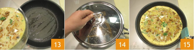 Vierte la mezcla de huevos en la misma sartén en la que has cocinado las setas 13. Cubre con una tapa 14 y cocina a fuego medio durante 6-7 minutos, luego despega los bordes de la tortilla con una espátula 15.