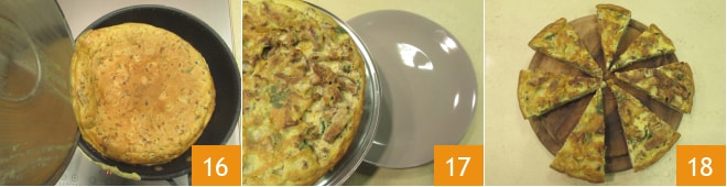 Gira la tortilla ayudándote con la tapa o con un plato, hazla deslizar nuevamente en la sartén 16 y cocina durante otros 6-7 minutos. Una vez lista, transfiere la tortilla de rebozuelos a un plato 17 y sirve 18!