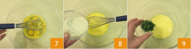 Vierte los huevos en un bol y bátelos con unas varillas 7, luego añade el Grana Padano DOP rallado 8 y el perejil 9.