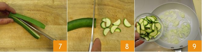 Recortad el calabacín y divididlo a la mitad en sentido longitudinal 7; cortad cada mitad en rodajas finas 8. Añadid también los calabacines en la sartén solo cuando las cebollas estén translúcidas 9.