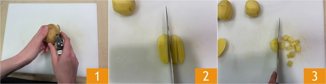 Para preparar la tortilla de patatas, pelad las patatas 1, luego cortadlas en bastones 2 y finalmente en cubos de 1 cm 3.