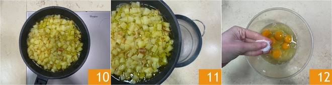 Después de 10 minutos, la mezcla estará casi cocida 10, así que retírala del fuego y escurre el contenido de la sartén con un colador, reservando el aceite 11. Deja que las patatas y las cebollas se templen. Mientras tanto, vierte los huevos en un bol y condimenta con sal 12 y pimienta.