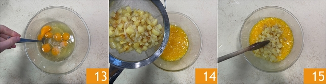 Bate con un tenedor 13, luego añade las patatas y las cebollas frías 14. Mezcla para integrar la mezcla 15.
