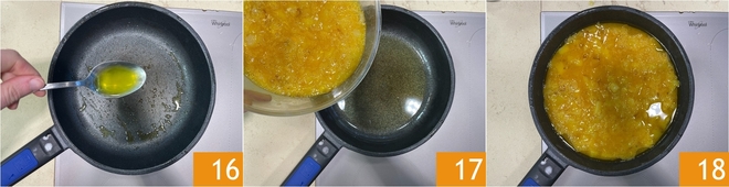 En la misma sartén, añade el aceite reservado 16, luego vierte la mezcla de huevos, patatas y cebollas 17 18.