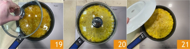 Cubre con una tapadera 19 y cocina a fuego bajo durante 16 minutos 20. Pasado este tiempo, los bordes comenzarán a despegarse de la sartén mientras que el interior aún estará jugoso: es el momento de darle la vuelta a la tortilla con la ayuda de un plato 21.