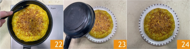Ajusta los bordes con la ayuda de una espátula para darle a la tortilla una bonita forma redonda, luego cubre con la tapadera y continúa cocinando durante 4 minutos, siempre a fuego lento 22. Una vez cocida, apaga el fuego y desliza suavemente la tortilla en un plato para servir 23. ¡Tu tortilla de patatas está lista para servir, caliente o a temperatura ambiente 24!