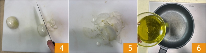 Limpia y corta la cebolla primero a la mitad 4 y luego en finas rodajas 5. Calienta bien una sartén antiadherente de 24 cm de diámetro, luego añade el aceite en abundancia 6.