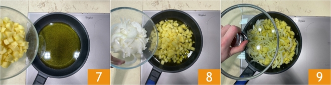 Añade las patatas 7 y cocínalas durante 5 minutos a fuego medio. Pasado este tiempo, añade las cebollas 8, tapa con la tapadera 9 y cocina a fuego lento durante 10 minutos.