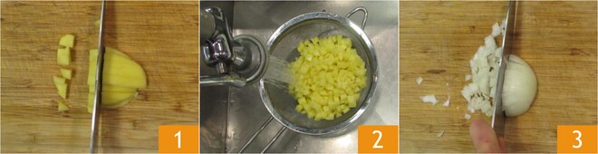 Para realizar la tortilla sin huevos, primero pelad las patatas y cortadlas en cubitos de medio cm 1, luego enjuagadlas bajo el agua corriente 2 y transferidlas a un bol con agua fría. Limpiad la cebolla y picadla finamente 3.