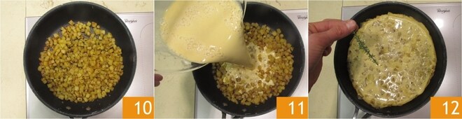 Cocinad durante 10-15 minutos a fuego medio, hasta que estén doradas 10. En este punto, dadle una vuelta a la mezcla y vertedla en la sartén 11, girándola ligeramente para distribuirla de manera uniforme. Bajar un poco el fuego y perfumar con el tomillo 12.
