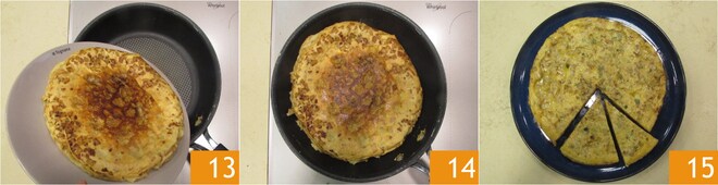 Cocinad a fuego medio-bajo durante 5-6 minutos, luego dadle la vuelta con la ayuda de un plato o una tapa 13 y continuad la cocción por el otro lado durante otros 5-6 minutos 14. ¡Vuestra tortilla sin huevos está lista para ser servida 15!