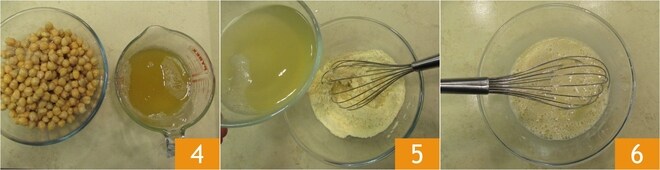 Escurrid los garbanzos (u otras legumbres) enlatados de su líquido de conservación, la llamada aquafaba 4. Verted la harina de garbanzos en un bol junto con una pizca de sal. Agregad poco a poco tanto la aquafaba 5 como el agua natural, mezclando con una batidora para obtener una mezcla lisa y fluida, sin grumos 6. Cubrid el bol con film transparente y dejad reposar en el frigorífico por 10 minutos.