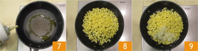 Calentad un poco de aceite en una sartén antiadherente de 20 cm de diámetro 7, luego añadid las patatas 8 y las cebollas 9, salpimentad.