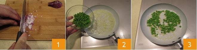 Para preparar las tortillitas al horno de espaguetis, comenzad por la cocción de los guisantes. Limpiad y picad finamente la cebolla 1, luego echadla en una cacerola junto con la mitad del aceite, dejadla pochar a fuego lento y añadid los guisantes 2. Cocinad los guisantes durante 5-6 minutos 3 añadiendo un par de cucharadas de agua. Apagad el fuego, salpimentad y dejad enfriar.