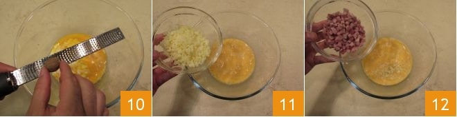 Añadid la sal, la pimienta, la nuez moscada 10, los cubitos de provola 11 y los daditos de jamón 12.