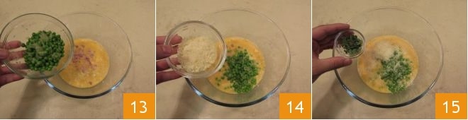 Incorporad los guisantes, ya fríos 13, el queso parmesano rallado 14 y las hojitas de mejorana 15.
