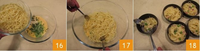 Por último, integrad los espaguetis cocidos 16 y mezclad todo hasta amalgamar todos los ingredientes 17. Dividid la mezcla obtenida en 8 moldes con un diámetro de 10 cm 18.