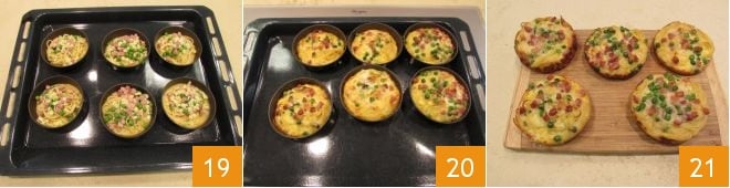 Colocad los moldes en una bandeja de horno y coced vuestras tortillitas en horno estático precalentado a 220° durante 30 minutos (si usáis el horno ventilado, coced en horno precalentado a 200° durante unos 20 minutos). Una vez horneadas 20, dejad templar las tortillitas al horno de espaguetis y desmoldadlas, ayudándoos con una cuchara, antes de servirlas.