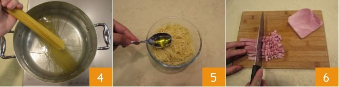 Mientras tanto, coced la pasta en abundante agua hirviendo, salada al gusto 4, durante un máximo de 3-4 minutos. Escurridla y vertedla en un bol, añadid la parte restante del aceite 5 para que los espaguetis no se peguen entre sí y dejad enfriar. Cortad el jamón en cubitos de aproximadamente 5-6 mm 6.