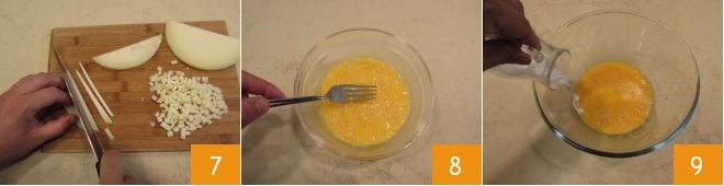 En este punto, cortad también la provola del mismo grosor que el jamón 7 y reservad los cubitos. En un bol lo suficientemente grande, romped los huevos, batidlos 8 y verted también la leche 9.