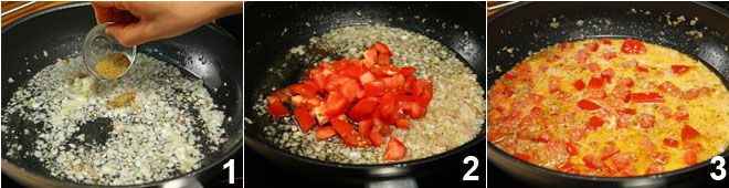 Preparar la salsa: picar finamente chalotas y ajo, calentar aceite en la sartén y dorar, añadir el comino y dejar que libere los aromas 1; añadir el tomate 2 cortado en trozos y sin las semillas internas, cocer un par de minutos a fuego lento.