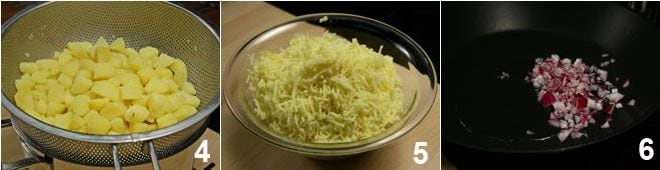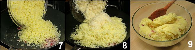 y añadir las patatas trituradas 7 y el queso rallado 8, cocer unos instantes y luego transferir a un bol 9