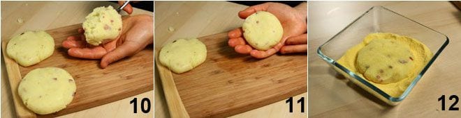 coger una cucharada de la mezcla a la vez 10 y formar tortitas planas con la ayuda de las manos 11, pasarlas bien por la harina de maíz 12 para que queden crujientes al cocer.