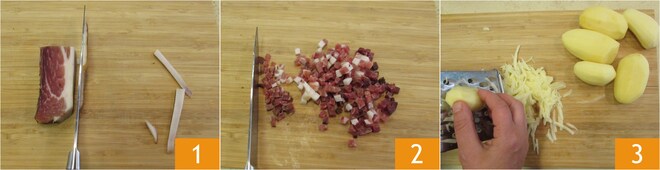 Para preparar las tortitas de patata y speck, eliminad la corteza 1 del speck y cortadlo en dados 2. Pelad las patatas y ralladlas con un rallador de agujeros grandes 3.