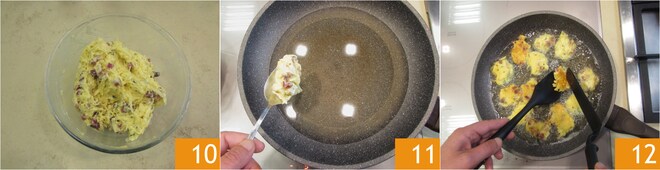 Mezclad para amalgamar todo 10. Ahora echad el aceite de semillas en una sartén y calentadlo hasta una temperatura de 160°-170°, luego ayudad con 2 cucharas para formar las tortitas 11. Freíd durante un par de minutos, aplastándolas ligeramente, luego dadles la vuelta y dorad también el otro lado 12.