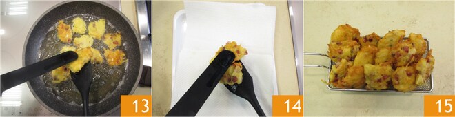 A medida que estén listas, escurridlas 13 en una bandeja cubierta con papel absorbente 14. ¡Disfrutad de las tortitas de patata y speck recién hechas 15!