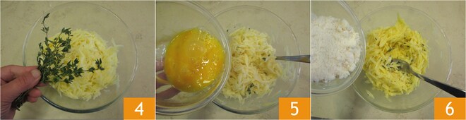 En un bol, echad las patatas, las hojas de tomillo 4, los huevos 5 y mezclad. Luego añadid el Parmigiano Reggiano DOP 6.