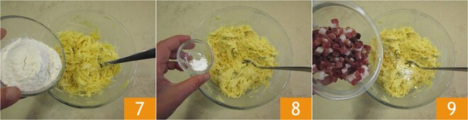 Incorporad también la harina 7 y la levadura 8. Por último, agregad el speck 9, sal y pimienta.