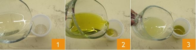 Para preparar las tostadas con salmón marinado, lo primero es preparar la marinada: en un biberón de cocina verted el vinagre de vino blanco 1, el aceite de oliva 2 y el zumo de limón 3.