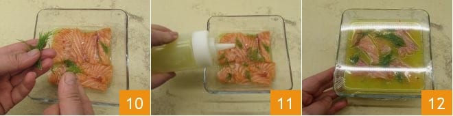 añadid un poco de eneldo 10 y cubrid con la marinada 11, luego continuad alternando las rodajas de salmón, los condimentos y la marinada hasta que se terminen los ingredientes. Cubrid la fuente con film transparente 12 y dejadla en el frigorífico a marinar durante 24 horas.