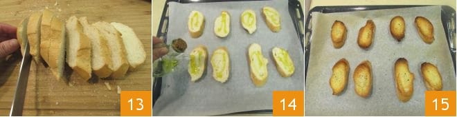Transcurrido el tiempo de la marinada, cortad el pan en rebanadas de 2-3 cm de grosor 13, colocadlas en una bandeja forrada con papel de horno y condimentadlas con un hilo de aceite 14, sal y pimienta negra. Precalentad el horno a 240° y hornead las rebanadas de pan durante 3-4 minutos con el grill encendido, luego retiradlas del horno 15 y dejad enfriar.