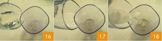 Mientras tanto, preparad la mayonesa falsa: en un recipiente alto y estrecho verted el aceite de semillas 16, el vinagre de vino blanco 17, la leche de soja 18 y una pizca de sal.